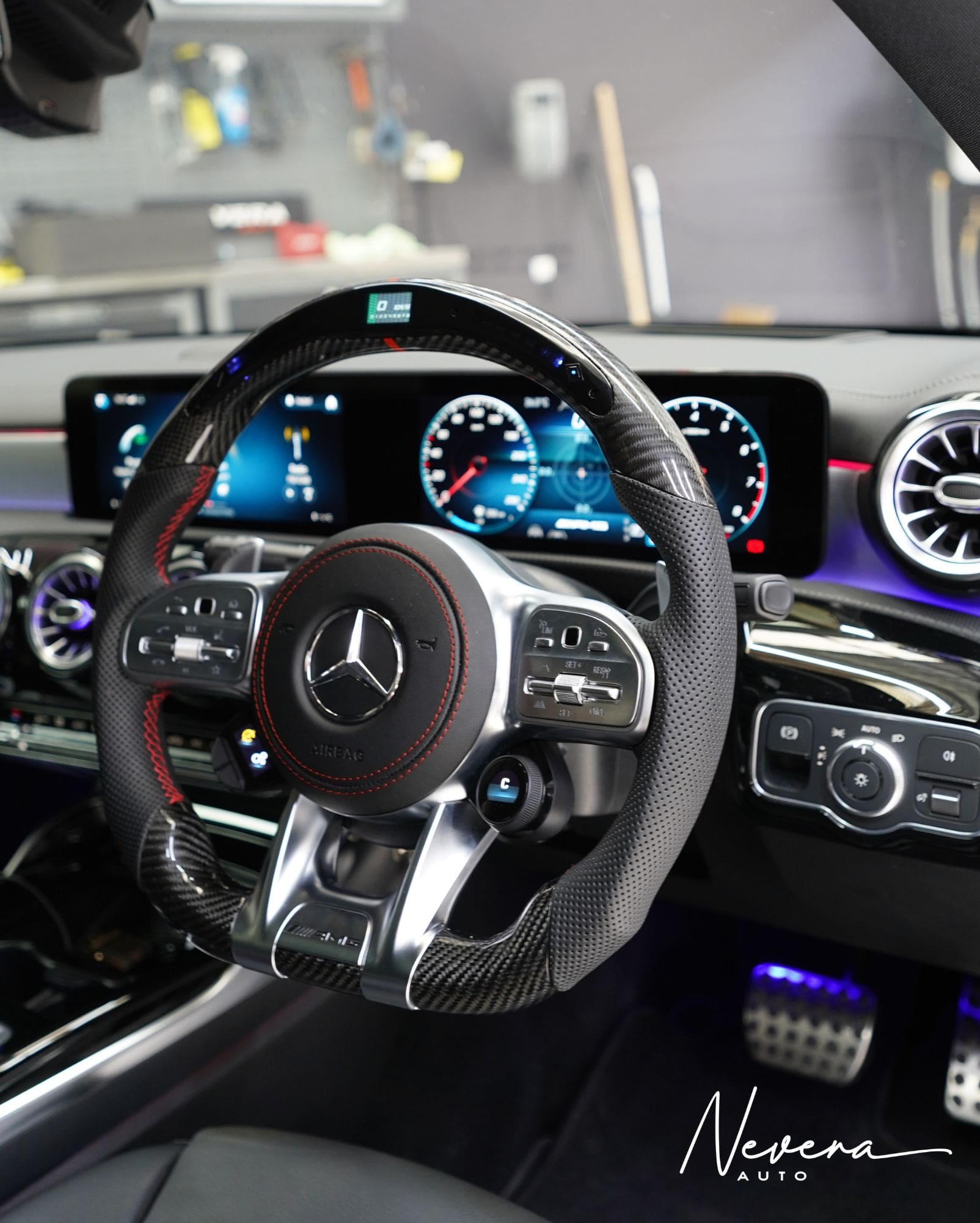 - Steering Wheel Upgrade – Original wheel replaced with a custom carbon AMG wheel while retaining all factory functions including heating and controls.
